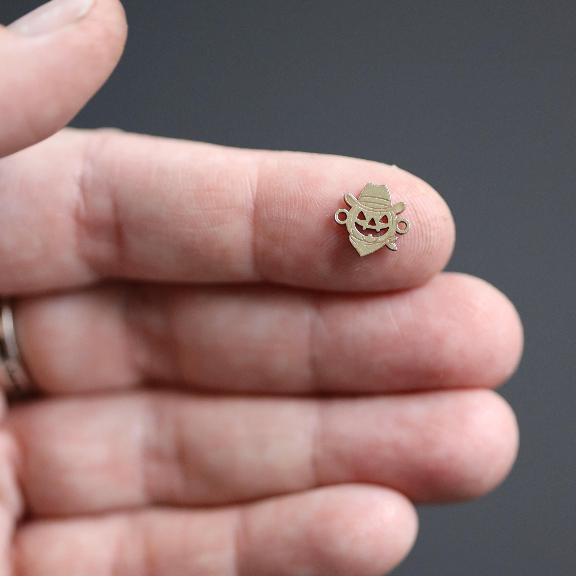 This 14k gold filled cowboy pumpkin bandana connector charm is the perfect addition to your jewelry-making collection. Featuring a festive pumpkin wearing a cowboy hat and bandana, this connector can be used as a pendant, bracelet link, or necklace charm. Crafted from high-quality 14k gold filled material (also available in sterling silver), it's ideal for creating seasonal, western, and Halloween-inspired jewelry.