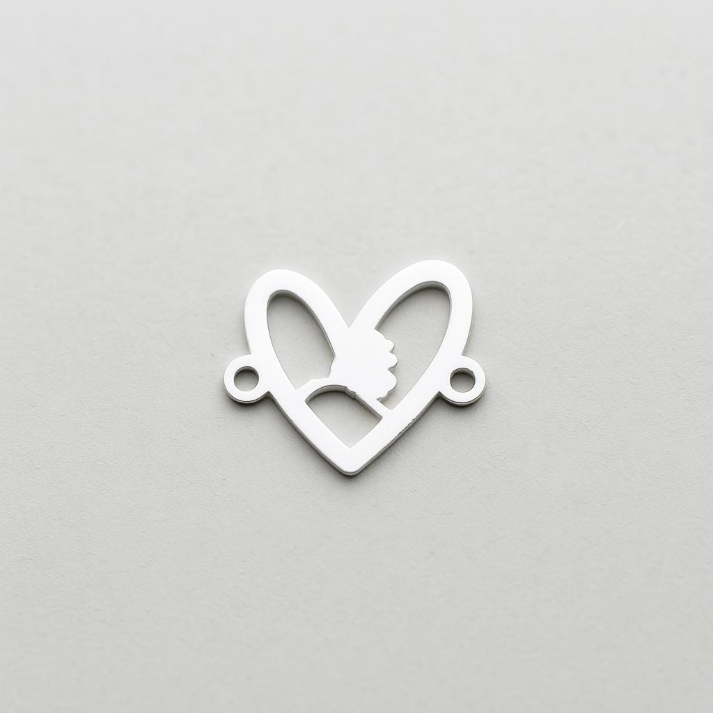 This special sterling silver connector charm features a heart with the Alaska silhouette beautifully cut out in the center. It's perfect for creating meaningful bracelets, necklaces, or keepsakes.